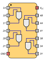 The 74x00 (and its military grade equivalent 54x00) is a Quad 2-Input NAND gate and one of the most important components in digital electronics. The chip provides four groups of 2 inputs (labelled A and B) and a single output (labelled Y) which outputs a HIGH (1) signal when either or both inputs are LOW (0), otherwise when both inputs are HIGH, the output becomes LOW.